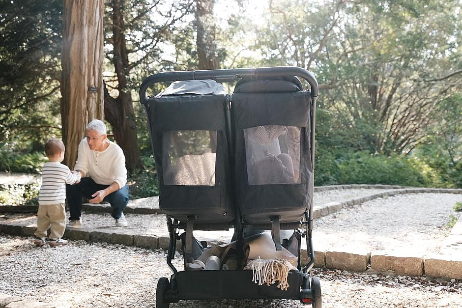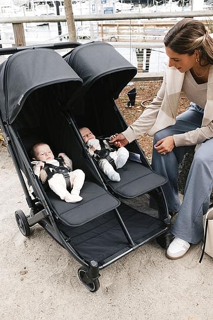 Een compacte zij-aan-zij wandelwagen voor twee kinderen, die vanaf de geboorte te gebruiken is, waarmee je gemakkelijk als gezin op ontdekkingstocht kunt gaan, waar je dag je ook brengt. * Met één hand te bedienen, diep achteroverleunende stoeltjes voor rustgevende wandelingen * Met één hand te bedienen, onafhankelijke voetsteunen * 100% volnerf lederen duwbeugel * Past door standaard deuropeningen * Grote, gemakkelijk toegankelijke mand met gewichtslimiet van 11,3 kg