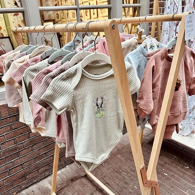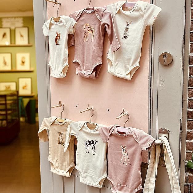 Organic cotton rompers, sweaters en joggingpakjes met schattige handgeschilderde dieren in lieve, zachte kleuren.